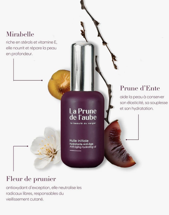 L’Huile Initiale garde ainsi la cohérence d’un soin extrait de la prune, tout en proposant les bénéfices cumulés d’extractions différentes, et de plusieurs espèces.