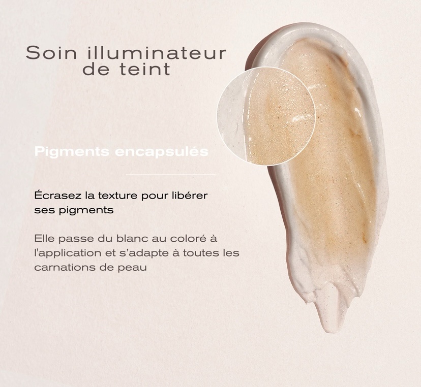 Des pigments encapsulĂ©s d’origine naturelle pour un effet bonne mine qui s’adapte Ă la carnation de la peau.